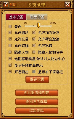 ●音乐:游戏音乐开关,右侧滚动条调解音乐音量 ●允许组队:勾选此项才可以与其他玩家组队 ●允许加为好友:勾选此项才可以将其他玩家或加为好友或被加为好友 ●允许交易:勾选此项才可以与其他玩家交易 ●允许帮会邀请:功能未开放 ●允许切磋:勾选此项才可以和其他玩家相互切磋 ●隐藏人物:勾选此项后会将附近其他玩家隐藏只看到名字 ●隐藏人物和名字:勾选此项后会将附近玩家连同名字一起隐藏 ●开启袭击:开启此功能后可以在落雁峰及其等级以上的野外地图对其他玩家进行袭击。 ●地图移动类型:始终以人物为中心:勾选此项后人物将始终处于地图中心 ●显示特殊物品掉落:取消此功能的勾选,在战斗结束后便不会物品掉落的提示框 ●保存设置:保存对以上功能的修改。 ●返回服务器列表:返回到服务器列表可重新选择所在线 ●返回角色选择:返回到角色选择界面,可重新选择人物 ●退出游戏:返回到登陆界面
