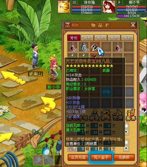 15.打开任务列表找到找到钱南山(14,9),与其对话完成任务,他会让你进入北影月森林寻找苏铁,再次与钱南山对话他会送给你一把13星的橙色武器 16.此时要做好出村面对各种怪物的准备,要记得打开人物属性面板分配自由分配点和穿上刚才通过任务获得的装备啊。(侠客、刺客为物理系职业加点以强壮和敏捷为主,修真和术士为法术系职业加点以智力和信仰为主)通过(20,7)的传送点可以进入北影月森林。 17.出村后任务npc许含文就站在对面。与他对话可将“缺少的草药”任务完成,并领取到两个新的任务“初露头角”“暴躁的兔子”,需要打败附近的怪物收集一些任务物品。战斗中可使用快捷键1或2释放技能,这样可以更快的消灭怪物。